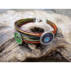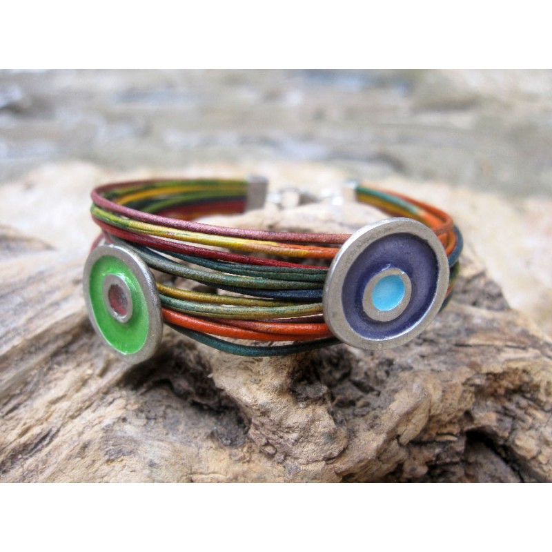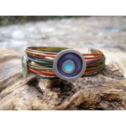 Colored bracelet with silver appliques and bleu and violet fire enamel. The cord is colored leather and the clasp is silver. At the time of purchase, please indicate the wrist length (visit the FAQ´s section)